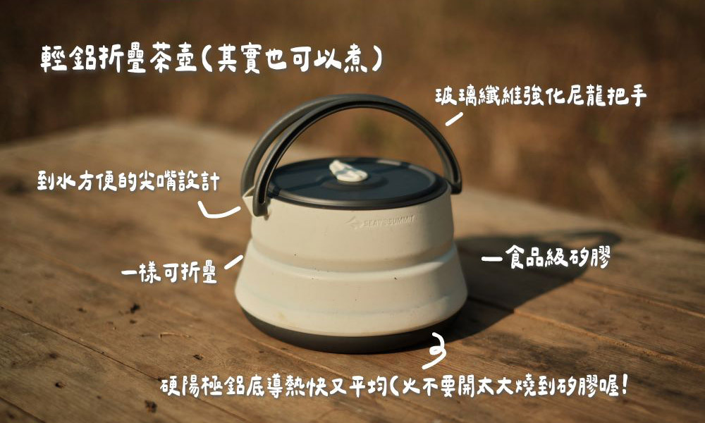 包含一個1.1升的水壺、1個折疊碗M、1個折疊杯。輕鋁矽膠折疊茶壺具有緊湊的設計和硬質陽極氧化鋁合金底部,有效傳導熱量,非常適合輕量化的冒險活動。