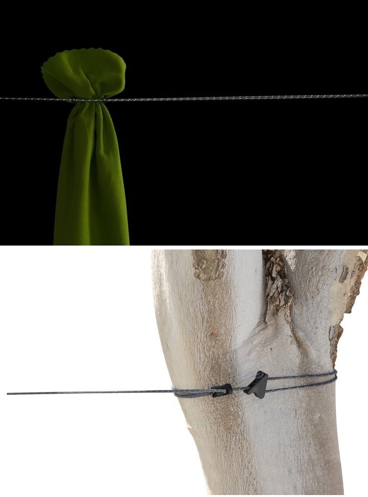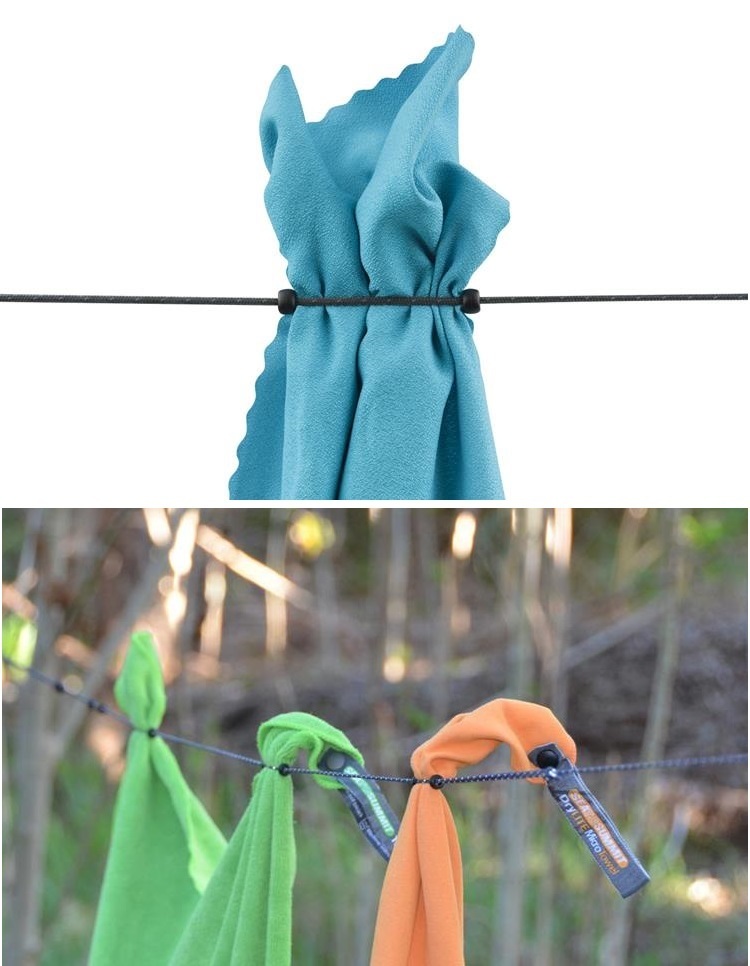 繩子上附有可移動的扣具,無須衣架即可吊掛固定衣物